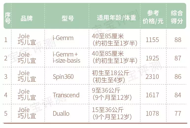 Joie巧儿宜这5款产品都是德国商品检测基金会在2016至2017年检测的产品,4款产品表现优良。