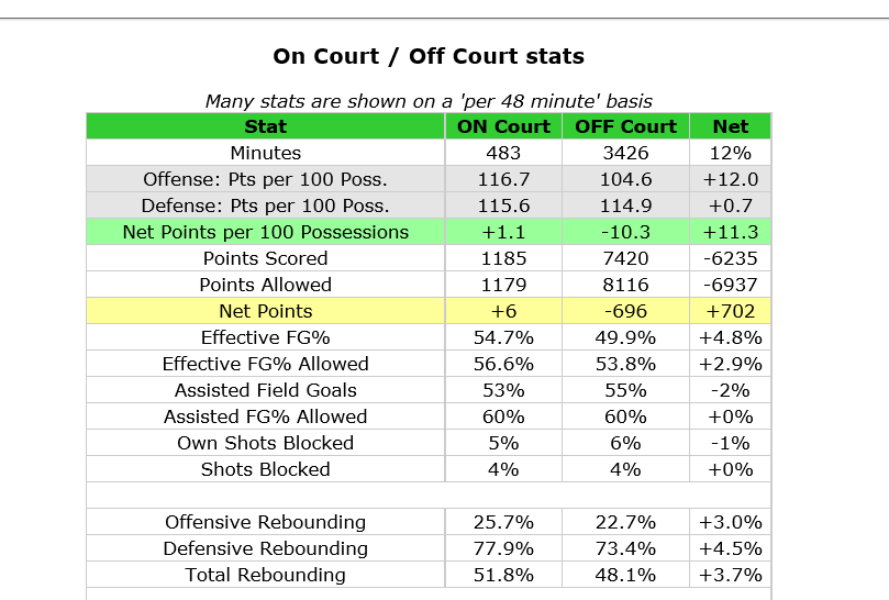 具体而言,当波特在场时球队篮板率为51.8%,不在场时篮板率为48.1%,差值为3.7%。在场时球队有效命中率为54.7%,不在场时有效命中率为49.9%,差值为4.8%。