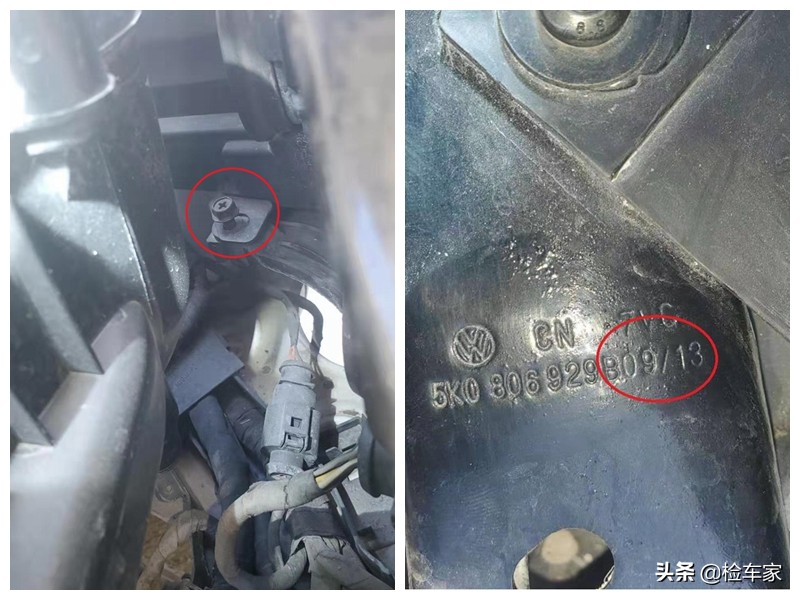 果然右前大灯是更换过了的,而且大灯固定螺丝都没上紧,不得不吐槽一下,这修理师傅也太敷衍了吧,我以前修车的时候绝对不会这样敷衍客户!然后可以看到大灯支架是后期更换的,生产日期为13年9月,也就是说有很大可能这台车的事故发生在7年以前,这么简陋的修复,用这么长时间也没出问题,也是运气好。接着来看看其它地方。