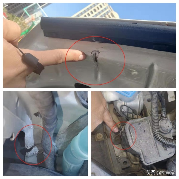 结果让我发现这车的前防撞梁严重变形,并未更换,简单修复之后又装回去,而且看到就能知道这辆车的修复工艺是有多差了,真的要吐槽一下了,要是这车是在4S店修的,那4S店的修复也太不靠谱了!而且也能看到左前叶子板也有过变形修复,螺丝错位生锈,保险丝盒也有明显开裂现象,这车不仅出过碰撞事故,而且后期使用的风险也比一般车高呢,看到这里我觉得有必要给客户的朋友先讲一讲。听到这车台的情况,客户朋友也是眉头一皱,说让我先看完吧,检查一下有没有重大事故的痕迹,而且来都来了,顺便他也可以学习学习,还可以看看到底二手车市场水有多深。