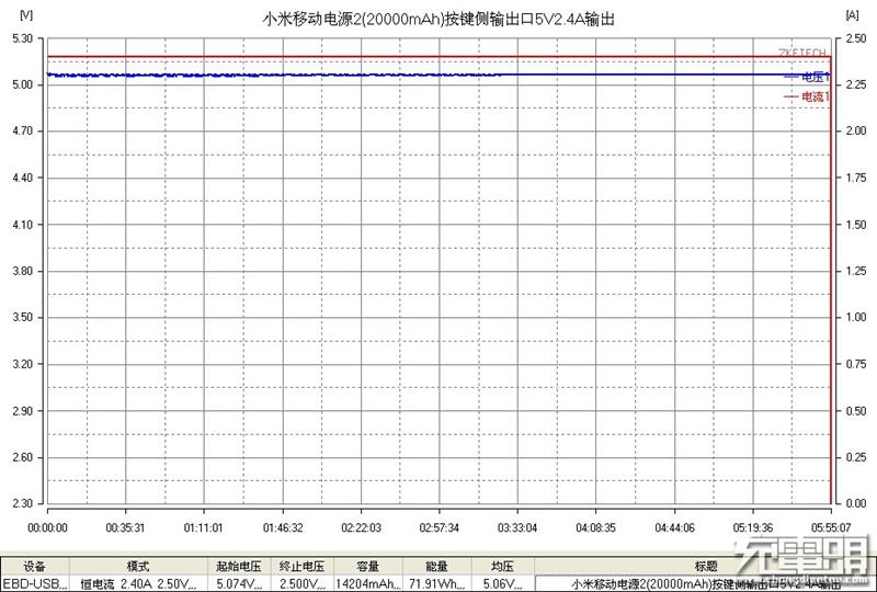 移动电源自充电测试:第一次充电使用乐视EQ-24BCN东洋版充电器进行充电,用EBD增强器进行记录,充满耗时6小时10分钟,比上代产品需要的时间少一点。从充电曲线反映,充电流是脉动变化的,与上代产品一样。