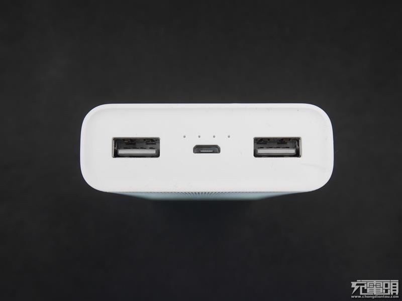 左右是两个USB-A输出接口,并没有标注输出口的编号,中间为Micro充电输入口,并没有采用日趋流行的Type-c接口,略感遗憾。