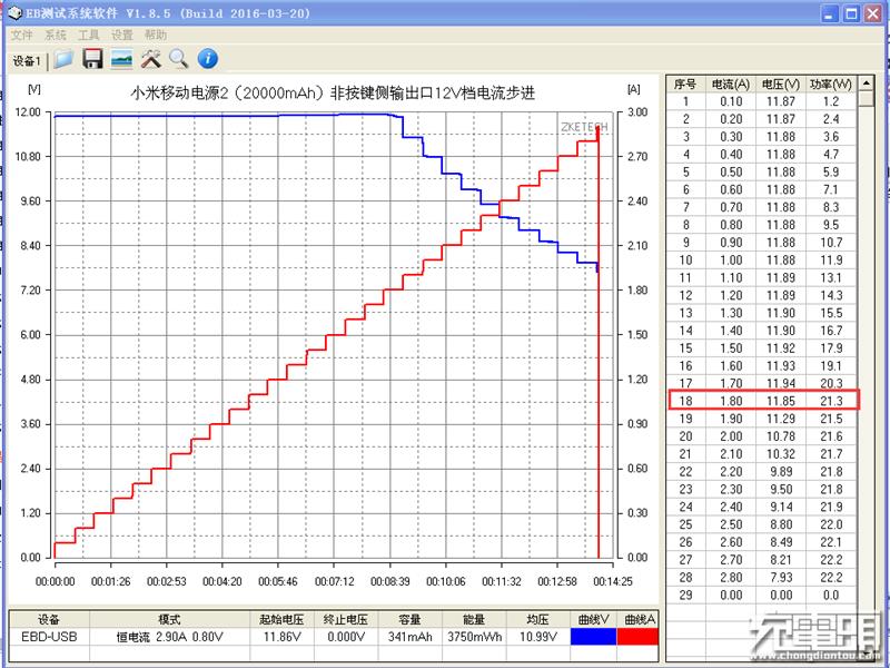 非按键侧输出口12V档电流步进:输出电压带线补,在输出电流为1.80A时电压为11.85V21.3W,输出电压为12V,但比标称的输出电流1.50和输出功率18W都要大。