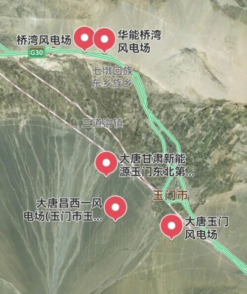 而在国内某地图软件上搜索,那片扇形区域内其实有好几家风力发电场。