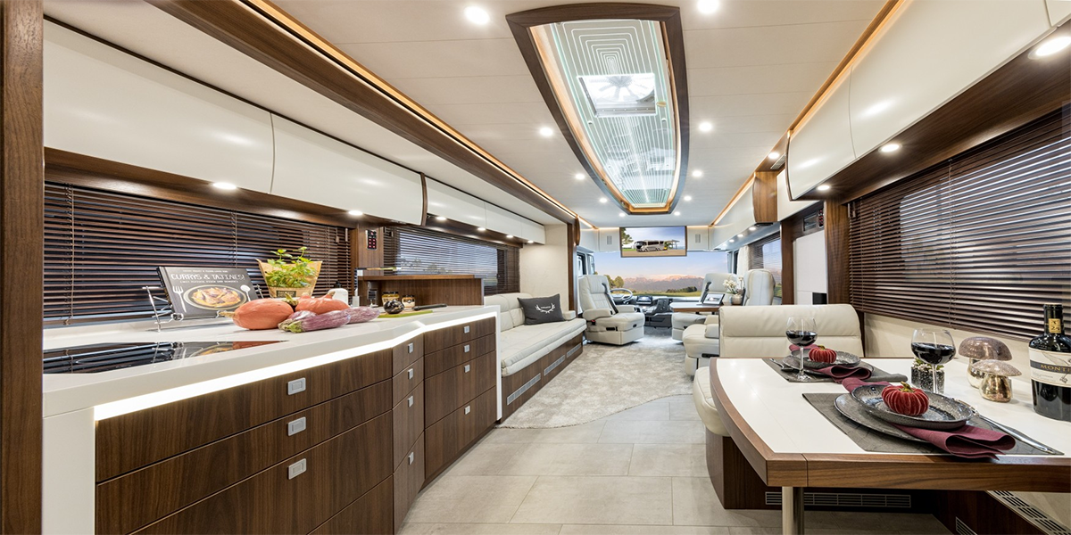 当然,VARIO Perfect PLATINUM 1200的亮点不仅限于车库,车厢内的生活区布局也是非常的吸引人,胡桃木与白色的组合形成了鲜明的对比,同时借助VARIO专有的Platinum LED照明系统,每个空间都能享受到温馨的氛围,灯光拥有记忆照明场景及各种调光功能。除了可旋转的正副驾驶座椅外,会客区还分别放置了一个单人航空座椅,一个纵置的长条沙发及一组对座卡座沙发。所有座椅均采用白色轻薄皮革包裹,低调奢华且具有舒适性。