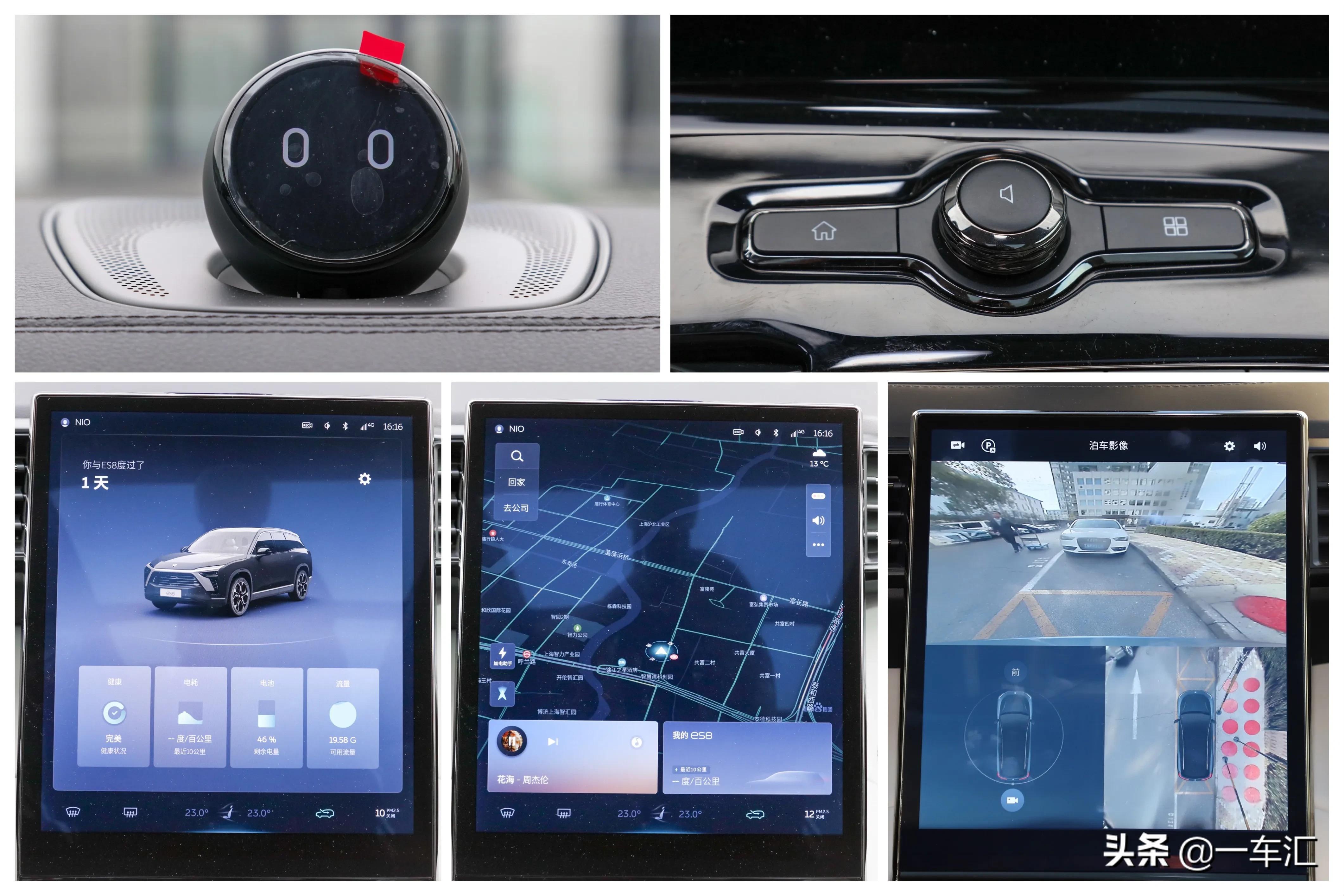 中控部分,基准版采用的是NOMI Halo车载人工智能系统,相比签名版的NOMI Mate 2.0系统,缺少了位于中控台上方可多角度旋转的圆形小屏幕,集成了声源定位功能后,签名版在仪式感和科技感方面都有着更好的体验。全系标配一块11.3英寸嵌入式中控触屏,屏幕造型工整,下方保留了几个常用功能按键和旋钮,屏幕分辨率1600x1400。NIO OS智能车机操作系统集成了大部分车辆功能调节,除了常规的GPS导航、实时路况提醒、道路救援呼叫、蓝牙电话、语音识别控制、以及车联网和OTA升级等主流功能外,还提供了诸如离车安全系统、远程互联控制、智能寻车助手、预约充电、车内环境智能预约等特色配置。基准版车内音响采用前后7扬声器单元,签名版升级为12扬声器环绕音响系统,且支持6种个性化声音氛围模式,配合车内智能10色氛围灯,带来更惬意的驾乘体验。