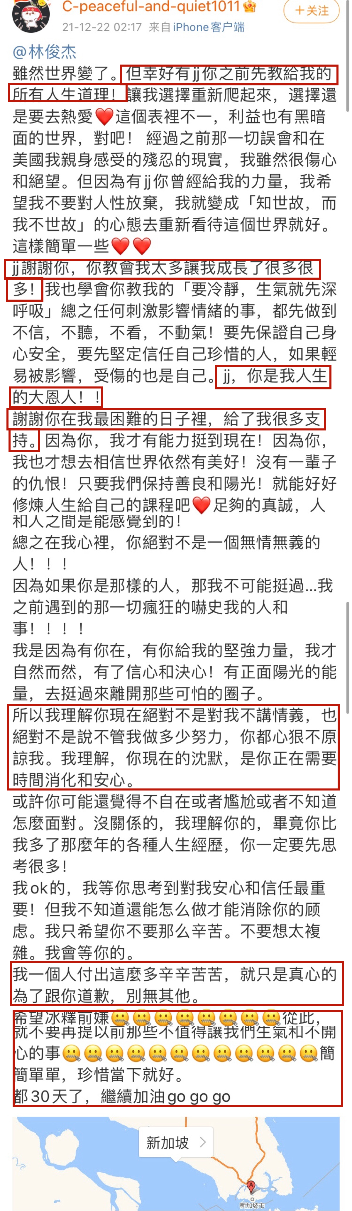 从该位网友的发布的长文中,总结出了几个点,“林俊杰教给了她非常多的人生道理,在她最困难的时候,给她了非常多的支持。但是两个人中间似乎有了一点小误会,林俊杰现在不搭理她,她飞去了新加坡等待林俊杰的回应。