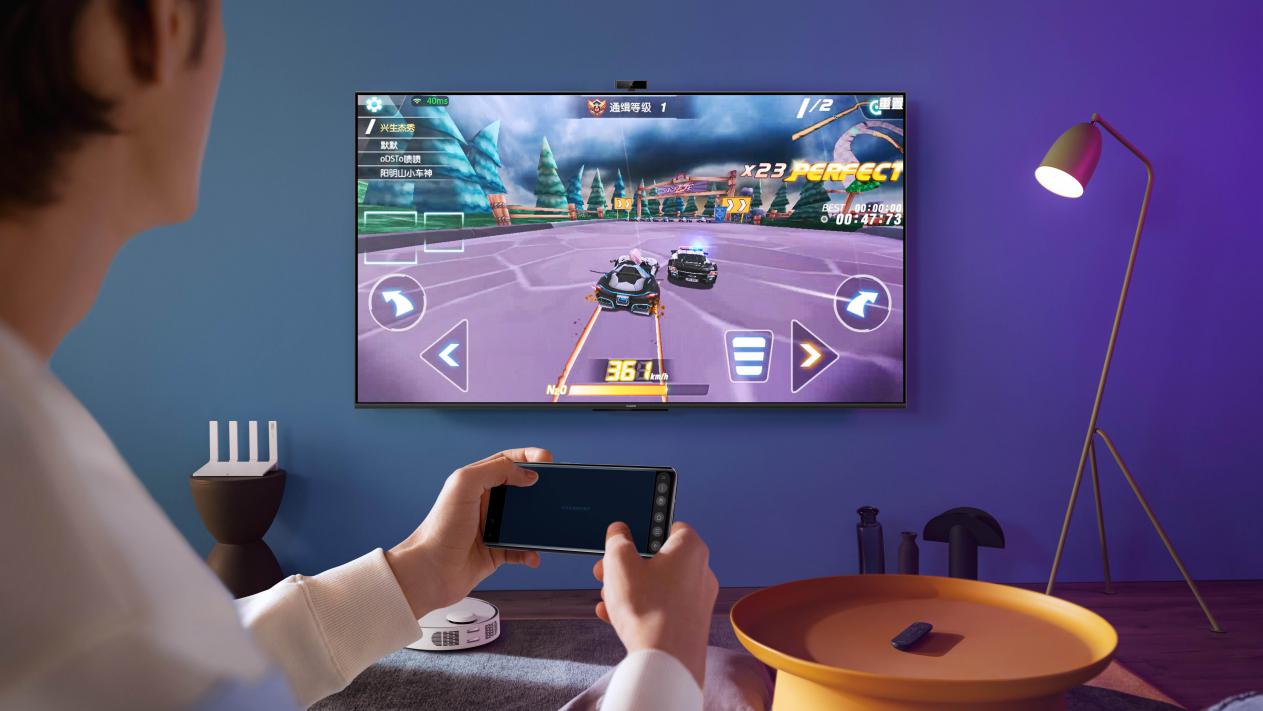 除了在音画质方面的优化升级,华为智慧屏 S系列还开辟了智慧屏娱乐的全新领域,搭载了分布式游戏和智慧屏K歌功能。其中,分布式游戏支持用手机替代游戏手柄,用户在玩赛车类游戏时,可以通过调用手机的触控屏和重力感应器或陀螺仪进行操控,游戏运行在智慧屏上,画面更加清晰流畅,带来沉浸酣畅的游戏体验。