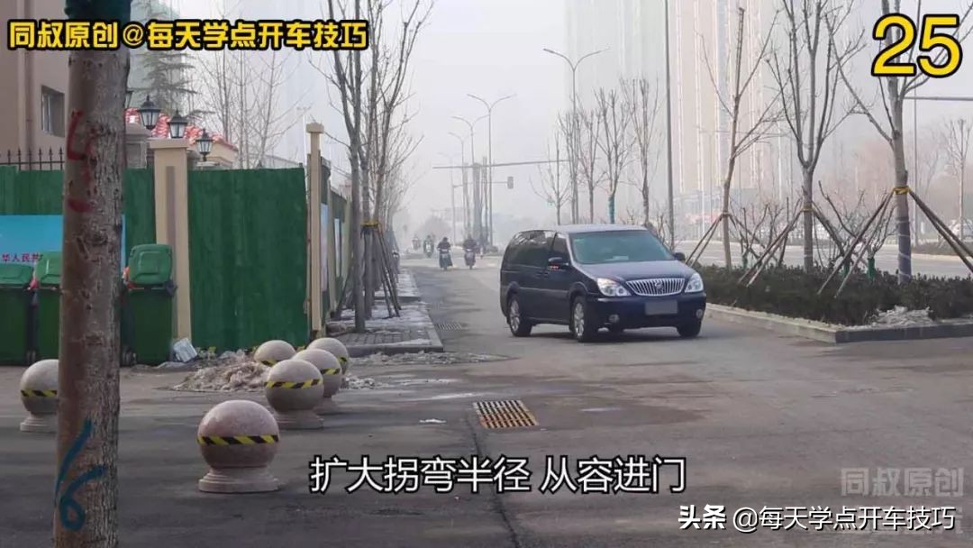 首先是能够利用路宽尽量去利用路宽,在道路宽度条件好的情况下,向左打方向贴近左侧极限位置,扩大拐弯半径,从容进门;