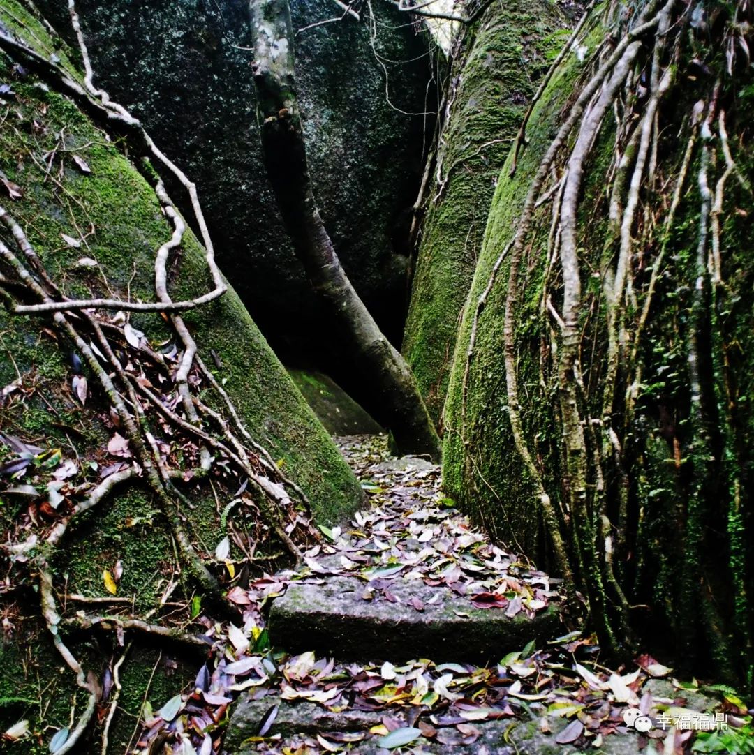 听说穿过“七星洞”就到了摩霄峰,这是太姥山五十四峰之首,海拔近千米。一入洞中,我早已疲惫的脚步开始兴奋地向上冲刺。突然,在过“通天”的途上,我又遇到一个盘旋峭壁的“夹巷”。我在一个奇特的石弄里穿行,两旁的石壁似快刀削过,笔直的如两大屏风,既光滑又湿淋淋的。石弄顶上的七块石头夹在两壁之间,只要一阵风轻拂,就会立即砸下?一阵山岚氤氲袭身,嵌着七块石头的地方特别亮,宛若这些石头正在发光,似北斗七星,乡人叫他“七星洞”。