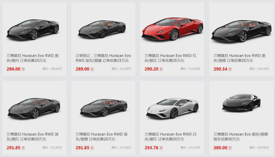 那么现在的兰博基尼,其入门车型大概是什么价位呢?按照官方指导价来看,目前最便宜的兰博基尼车型是“小牛”Huracán EVO RWD,官方指导价为254万元。这可比同级的法拉利F8还要便宜不少,但是和法拉利的“尿性”一样,如果你想花254万元提到这台“小牛”,显然是不可能完成的任务。以目前兰博基尼Huracán的市场报价来看,Huracán EVO RWD的现车在选配后价格普遍在300万元以上,即便算上市场优惠,想要提车也要花超过280万元。
