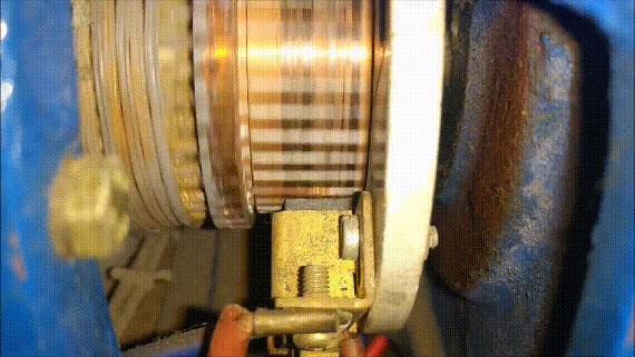 换向器由两个半圆段构成,连接处由绝缘材料隔开,两段换向器转动分别与碳刷连接,碳刷会重复连接到符合推动力的那段换向器,这样重复电机就转动起来了。