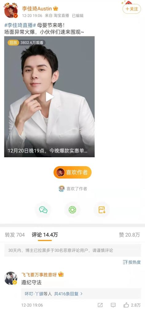 他当晚的直播微博下有14.4万条评论,点赞最高的只有四个字,“遵纪守法”。