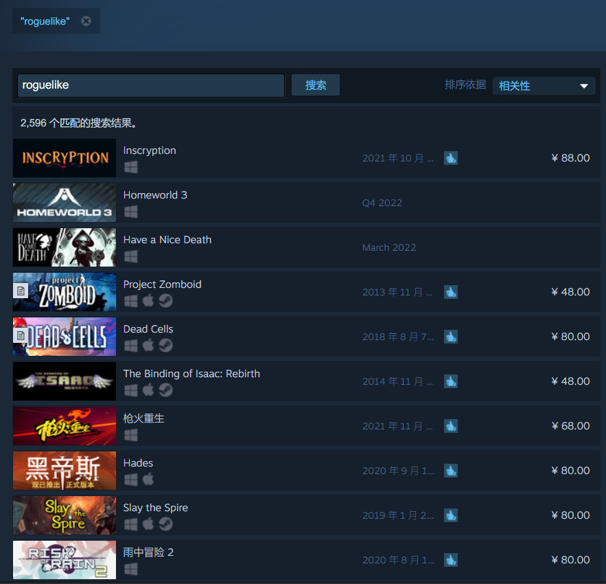 我们可以试着在Steam上搜索一下Roguelike游戏,近2600款上架的游戏当中,可以说基本上都是大大的拇指,特别好评、好评如潮,往下翻阅的时候甚至很难翻到褒贬不一、差评等负面的评分。这足以可见Roguelike类型的游戏已经深入玩家的心中。