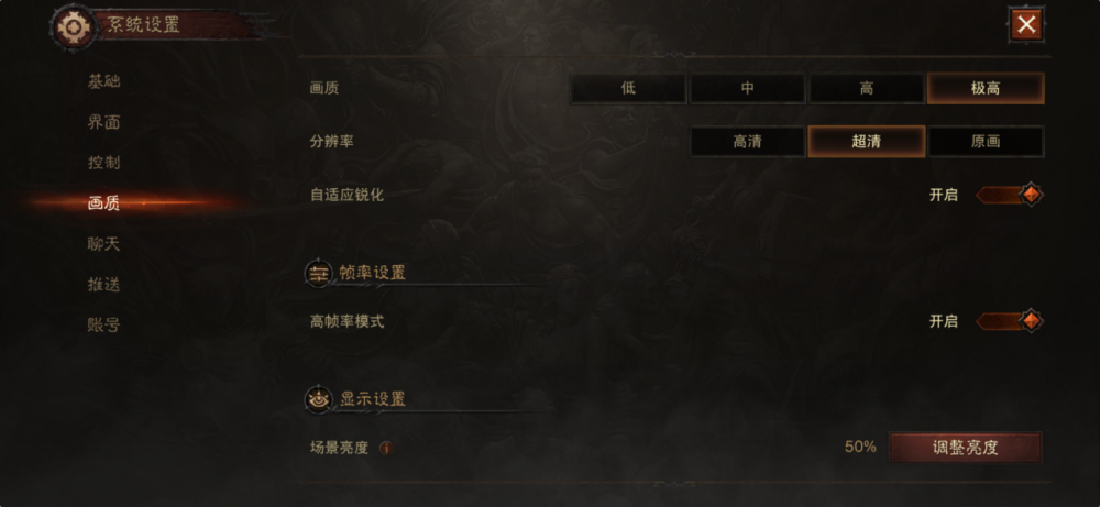 至于玩家们担心的帧率、画面问题,后台也贴心地开放了高帧率、极高画质以及场景亮度的选项,再从画面这一方面来讲,真的是与PC端体验无差异化。